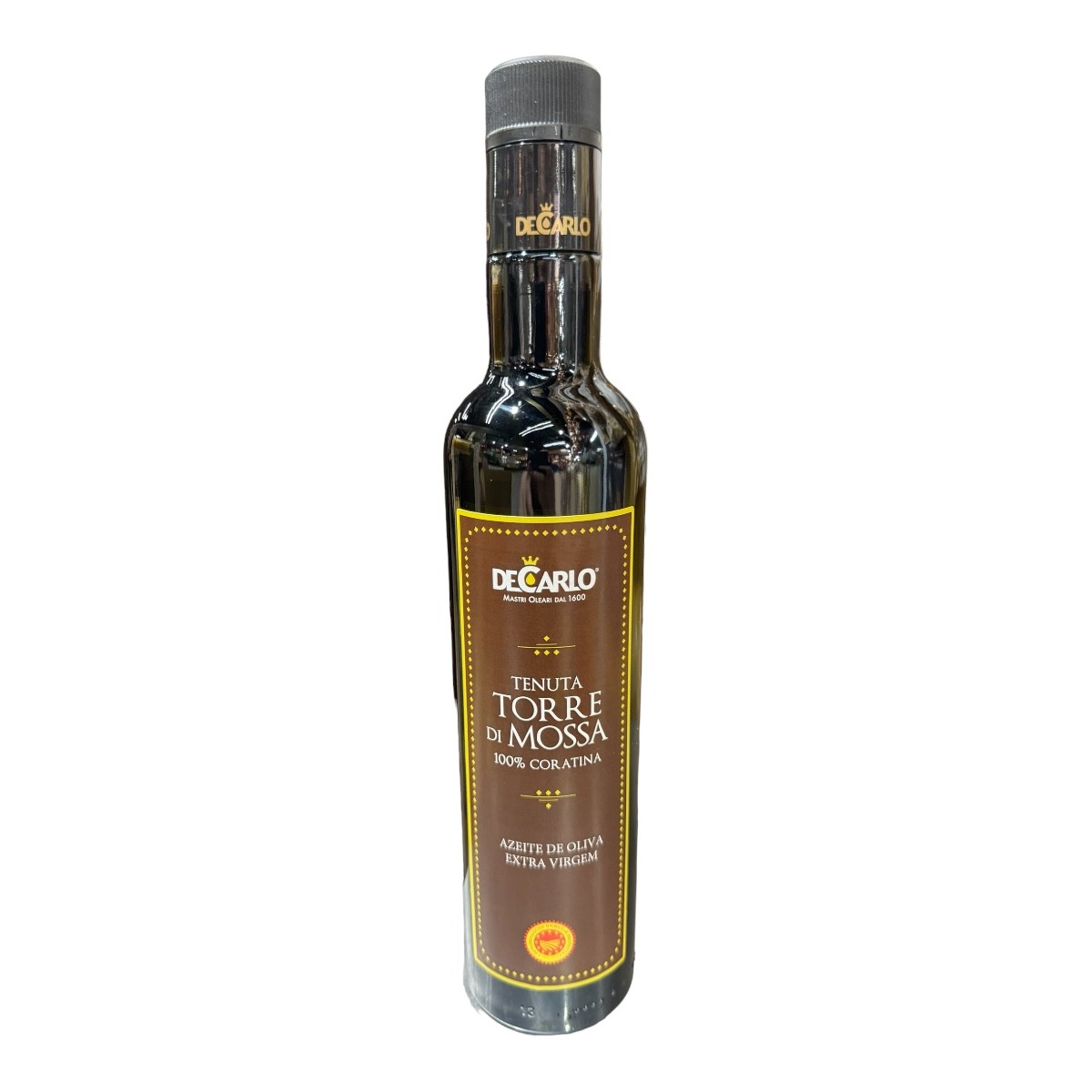 Esse azeite de oliva extra virgem Tenuta Torre di Mossa DOP 100% Coratina é proveniente das terras da fazenda Arcamone, uma das históricas propriedades da família De Carlo, com uso do cultivo biológico desde 1990. A variedade Coratina, é produzida sem o auxílio de produtos químicos, graças a um microclima favorável capaz de sustentar naturalmente seus ciclos de produção.