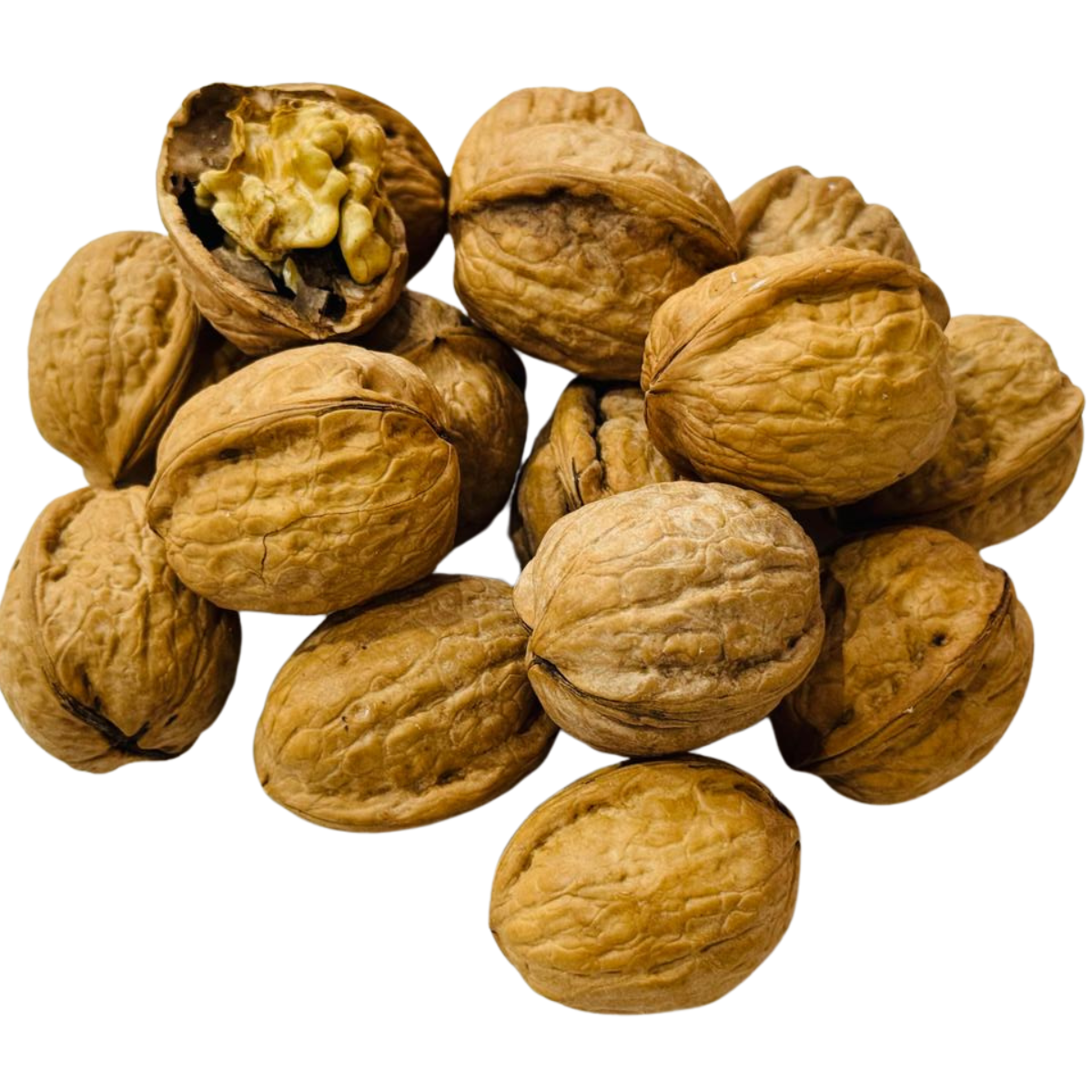 As nozes chilenas com casca são um fruto seco que ainda não foi descascado, com uma casca externa marrom e dura, e um interior oleaginoso e nutritivo. São ricas em nutrientes, como:
